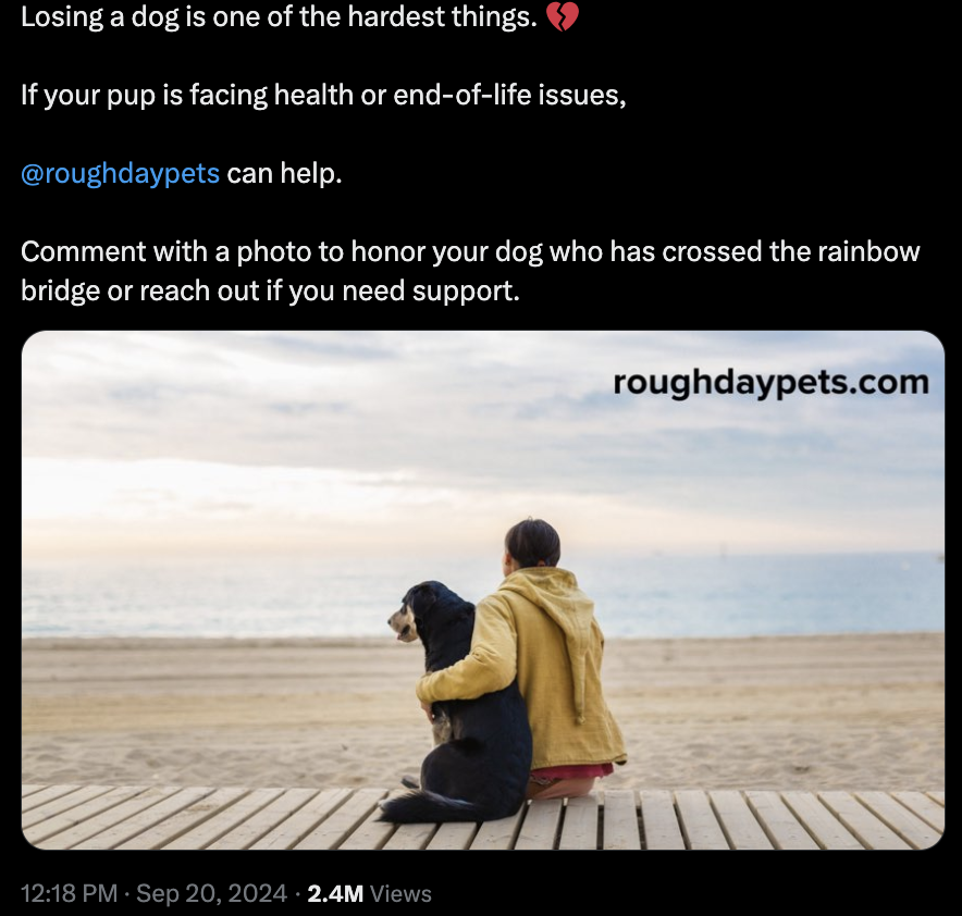 At our core, Rough Day Pets is an SEO-driven platform focused on connecting pet parents with compassionate support for pet loss and grief. But our mission goes beyond that. We’re dedicated to raising awareness around pet grief counseling and making these services widely accessible to every family in need. To achieve this, we’re investing in both online and offline communities to provide comfort and drive meaningful support. One example is highlighted in our recent case study, where we connected with 2.4 million grieving pet parents in under 48 hours on X. Click below to learn more about how we’re making a difference.